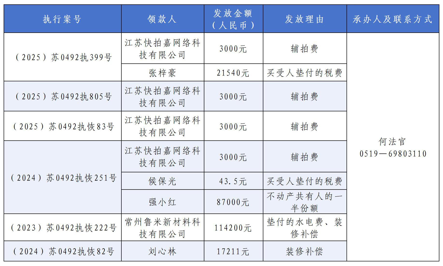为进一步规范执行行为,强化执行案款发放的透明度和公信力,根据最高人民法院《关于执行款物管理工作的规定》和江苏省高级人民法院关于加强案款管理系列文件精神,现对下列执行案款发放进行公示,公示期三天(自本公示发出之日起计算)。公示期间,案外人或其他利害关系人对案款发放有异议的,可在公示期间向本院提交书面异议意见并附相关证据材料,由本院审查处理。公示期满无异议的,本院将根据执行案款管理规定依法予以发放。