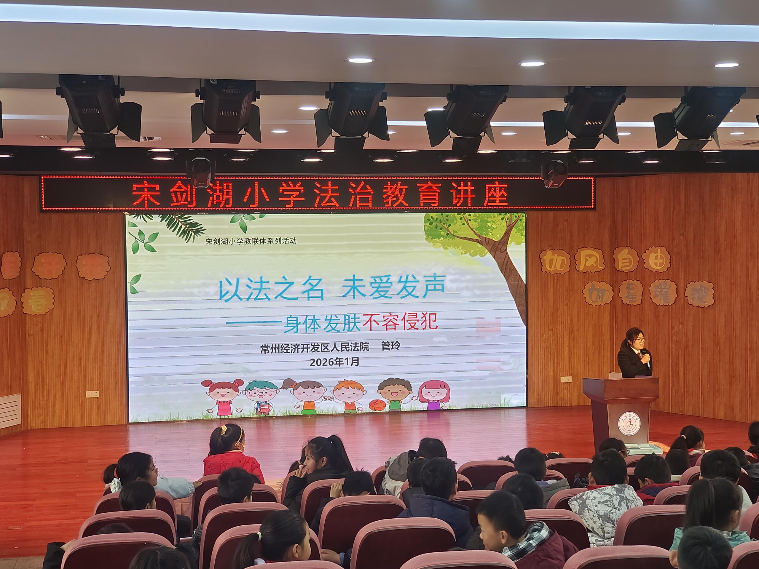 为切实增强未成年人自我保护意识和能力,筑牢校园安全防线,2026年1月14日,经开区法院民庭副庭长管玲走进宋剑湖小学,为在校二三年级师生带来了一堂生动而深刻的法治宣传教育课。本次活动聚焦“预防性侵犯”与“反对校园霸陵”两大主题,通过法官讲解、情景模拟、互动问答等形式,将法治的种子播撒进孩子们的心田。